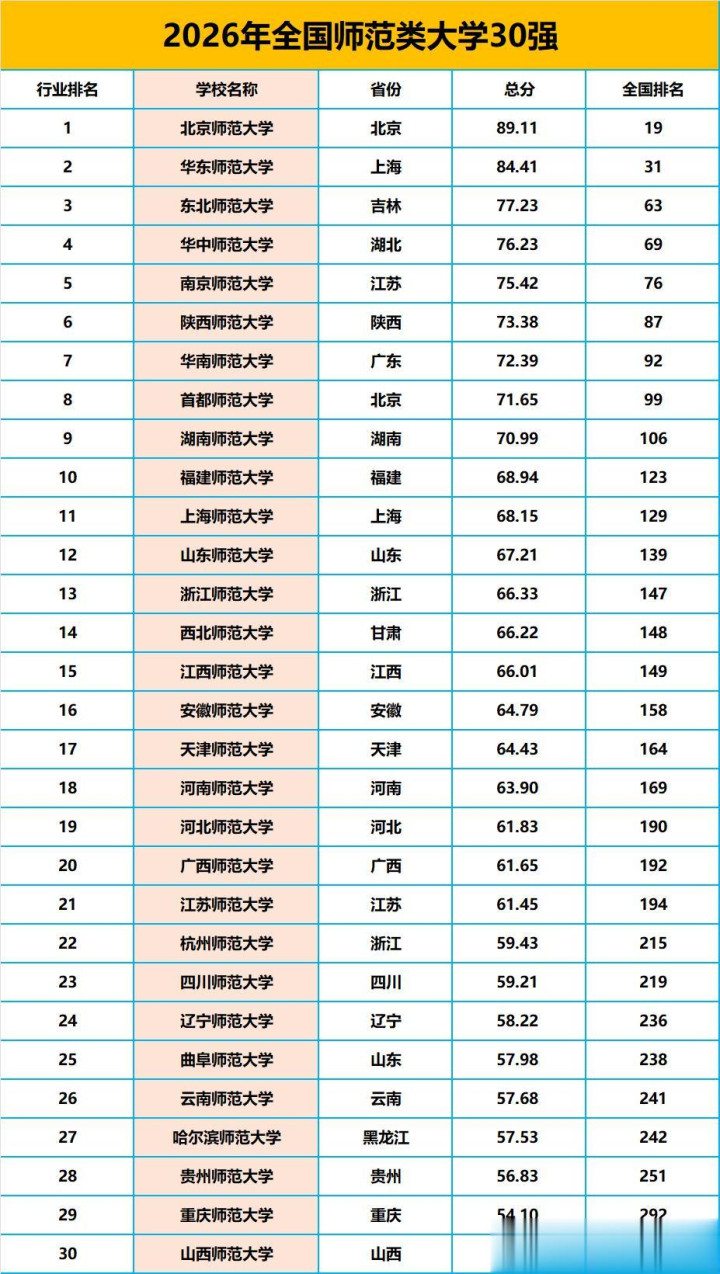 2026年全国师范大学30强出炉! 陕师大屈居第6, 山师排名第12